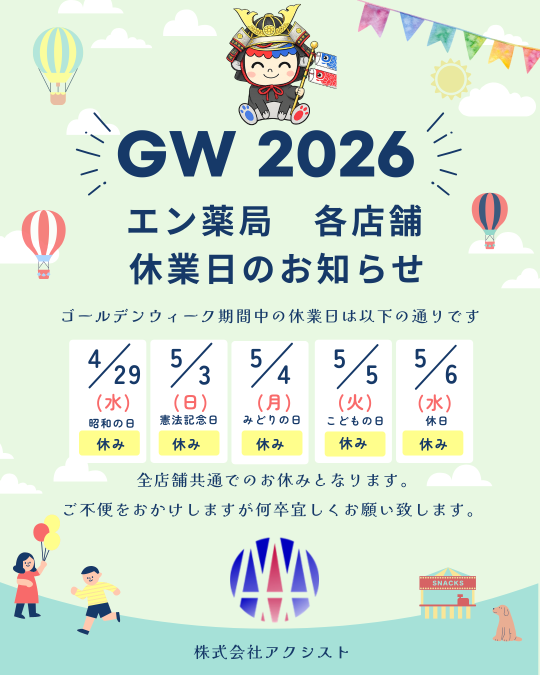 《ゴールデンウィーク》休業日のお知らせ⋆͛📣 2026年04月20日 《ゴールデンウィーク》休業日のお知らせ⋆͛📣こんにちは!株式会社アクシストです💊✨ 平素より『エン薬局』をご利用いただき、誠にありがとうございます。 各店舗の ゴールデンウィーク期間中の休業日 についてお知らせいたします🗓⏱𓈒𓏸 詳細は、画像にてご確認ください。 お薬の残数などをご確認のうえ、 余裕をもってご来局いただきますようお願いいたします💊✨ 休業中ご不便をおかけしますが、 何卒よろしくお願い申し上げます。